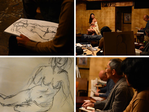アート系の学校にて開催しているヌードクロッキーのワークショップを一般開催。ヌードに限らず、着物、ムービングをはじめ、殺風景なアトリエを飛び出し、バー、古い民家など独特の世界観の中での独自のクロッキー会を行います。